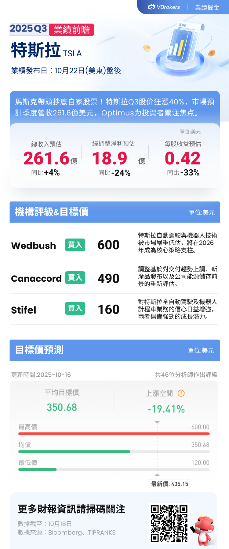 据华盛顿新闻网10月16日报道,特斯拉将于10月22日收盘后公布2025年第三季度财报;据彭博社分析师预计,特斯拉Q3营收为261.6亿美元,同比增长4%;调整后净利润为18.9亿美元,同比下降24%。据tiprank统计,回顾特斯拉过去8个财季的表现,只有两个季度的每股收益超出预期。业绩公布后股价平均变动±10.52%,最大涨幅+21.9%,最大跌幅-12.3%。财报发布后首日股价上涨的概率为50%。特斯拉第三季度股价大涨40%!马斯克带头猎杀自己的股票。回顾三季度,在诸多利好因素的推动下,特斯拉Q3股价涨幅惊人,达到40%。钍e股价一度接近历史新高,反弹幅度较年内低估超过100%。一方面,该公司全球交付量达到49.7万辆,同比增长7.4%,创下新的季度交付记录,并超过华尔街预计的44.8万辆。与此同时,特斯拉还在本季度推出了六座Model YL、Model Y以及低价版Model 3。人们期待已久的机器人业务正在快速进展。该公司已正式宣布正在致力于扩大人形机器人的尺寸。计划2025年底推出第三代,2026年开始量产。预计到2030年,马斯克的年产量将达到100万台。另一方面,“灵魂人”马斯克在第三季度购买了10亿美元的自有股票。这是马斯克多年来首次大幅增持公开市场持股。这被市场解读为乐观特斯拉的发展前景,提振了投资者信心。特斯拉第三季度财报值得关注哪些内容?特斯拉车辆交付量增加或不稳定 交付报告显示,特斯拉总交付量达到497,099辆,但Wedbush分析师认为,这一数据主要得益于中国市场的强劲复苏以及美国市场在车辆税收优惠取消之前提前释放的需求。与此同时,购买科特斯拉的tse的诸多折扣也推动了交付量的增加。富国银行估计,特斯拉第三季度平均订单价格环比小幅下降,其中Y/3定价模型环比下降1%。该银行认为,就未来一段时间内的交付量而言,第三季度可能是特斯拉最强劲的季度。为了维持交付规模,公司需要继续推出有吸引力的政策和折扣来抵消美元到期的影响7,500 信用额度。如果本季度擎天柱生产的发展能够稳步推进,马斯克已经多次谈到擎天柱的业务,并全力投入擎天柱的生产等工作。他还在特斯拉的“宏伟计划4.0”和个人激励提案中提到,10年内将交付总计100万台人形机器人。东方证券认为,在这一目标的推动下,特斯拉有望继续加大对机器人的投入。该机构强调,特斯拉正在进一步提升人形机器人的战略地位,预计2026年实现产量大幅增长;开放安全测试 按特斯拉交付 100 万台擎天柱机器人计算,对应市值为 5000 亿美元。 Robotaxi服务正在逐步扩大。该公司正在逐步将测试覆盖范围扩大到多个州。特斯拉在奥斯汀推出 Robotaxi 服务并将开始运营第三季度在亚利桑那州对其自动驾驶在线叫车服务进行了道路测试。此外,特朗普政府对该领域的支持可能会加速相关板块的推进,华尔街提前上调目标价!韦德布什:市场严重低估了特斯拉潜在的转型。根据Tipranks的最新数据,华尔街各大银行对特斯拉的目标价格存在显着差异。只有42%的机构给予“买入”评级。目前平均目标价为365.88美元,低于市场价,最高目标价为每股600美元。韦德布什:市场严重低估了特斯拉的转型潜力! 2026年初市值将达到2万亿美元。韦德布什大幅上调特斯拉目标价至600美元,称市场严重低估了特斯拉的转型潜力——自动驾驶和机器人将是主要战略重点2026年,这个“游戏规则改变者”将直接决定公司未来的方向。该行认为,在牛市情景下,特斯拉市值预计在2026年初达到2万亿美元,随着自动驾驶和机器人的规模化生产,年底甚至可能增至3万亿美元。 Stifel:将特斯拉目标价提高至 483 美元,增强对 FSD 和 Robotaxi 的信心。由于特斯拉全自动驾驶(FSD)取得进展,Stifel 将目标价从 440 美元上调至 483 美元。斯蒂菲尔表示,人们对特斯拉全自动驾驶和机器人出租车业务的信心正在增强。该机构预测“无监督模式完全自动驾驶”将于2025年底在美国市场推出,并认为机器人出租车和Optimus人形机器人业务具有强劲的增长潜力。 Canaccord将特斯拉目标价上调至490美元,对交付量和能源业务增长持乐观态度。迦拿ccord Genuity 将特斯拉的目标股价从 333 美元上调至 490 美元,并重申买入评级。此次调整是基于对上行输电趋势、新产品推出以及公司储能前景的重新评估。在能源存储方面,该券商预计,随着公用事业和超大规模数据中心的加速发展,势头将更加强劲。随着对电网的纯粹依赖的斗争日益激烈,储能将在用户侧解决方案中发挥重要作用。焦点特斯拉相关投资标的临近,与特斯拉相关的产业链其他个股还有哪些? mTesla车载模块(港美)电池组相关上市公司三星电子($SSNLF)松下($pcrfy)必和必拓($BHP)赣锋锂电($01772.HK)天齐锂电($09696.HK)意法半导体($$STM)德州仪器($$STM) TXN) Tyco Electronics ($ Tel) 热管理 Texas Instruments ($ TXN) Modine Manufacturing ($ mod) 智能驾驶舱和 ADAS半导体 ($ ON) 移动 ($ mbly) 法雷奥 ($ Vleey) at T ($ T) Advanced Micro Office ($ AMD) Nvidia ($ NVDA) 德州仪器 ($ TXN) 康宁 ($ NVDA) 德州仪器 ($ TXN) $ Glw) 突然 ($ shcay) 耐世特 ($ 01316.hk) 浙江世宝 ($ TXN) 01057.hk)底盘和车身大陆集团($ CTtay)利金科技($ 00558.hk)曼加纳国际($ MGA)李尔($ Lea)安道拓($ adnt)福耀玻璃($ 03606.HK)。 DirExion $ TSL 1.25 倍每日多头特斯拉 ETF - Graniteshares $ tsll 1.5 倍每日多头特斯拉 ETF - Direxion 您聪明的投资者对基金表现持乐观态度特斯拉信号吗?欢迎大家留言讨论。风险提示:投资涉及风险,证券价格可