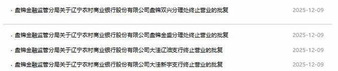 据国家金融监督管理总局辽宁监管局消息,两天之内,辽宁农村商业银行14家分行获准终止营业。具体来说,12月9日,盘锦金融监管局下发四批批复,同意辽宁农村商业银行大洼新余支行、大洼辽有支行、盘锦金盛支行、盘锦双兴支行停止营业。 12月10日,国家金融监督管理总局朝阳监管分局下发10份批复,同意建平惠州分行、建平丰源分行、朝阳新华路分行、朝阳凌河分行、建平光明分行、凌源东张、凌源分行凌源市力保保分行、凌源羊杖子分行、凌源新杖子分行终止营业。谢谢这是辽宁农村商业银行总部的公开信息是沉阳农村商业银行与北票农信联社等30家农村信用机构共同组建的。 2023年9月,辽宁农村商业银行获辽宁省监管局批准开业,并取得金融许可证。原沉阳农商行及30家农村信用联社依法终止,相关业务由辽宁农商行全面接管。新成立的辽宁农村商业银行是全国首家商业级商业银行,注册资本207亿元。总行下设总行营业部等25个部门,27个一级分行,833个营业网点。 2024年6月,辽宁农商行重新获批吸收合并新民农商银行C等36家农村中小银行机构。并接管了36家农村中小银行机构清算验资后的有效资产、全部负债、业务、网点和员工。数据显示,今年以来,实体银行网点拆除步伐明显加快,今年已批准关闭网点超过9000家。这一数字较2024年的2533家增长了200%以上,体现了银行业数字化转型背景下优化整理线下渠道的趋势。来源:沉阳人的金融业是一个家庭