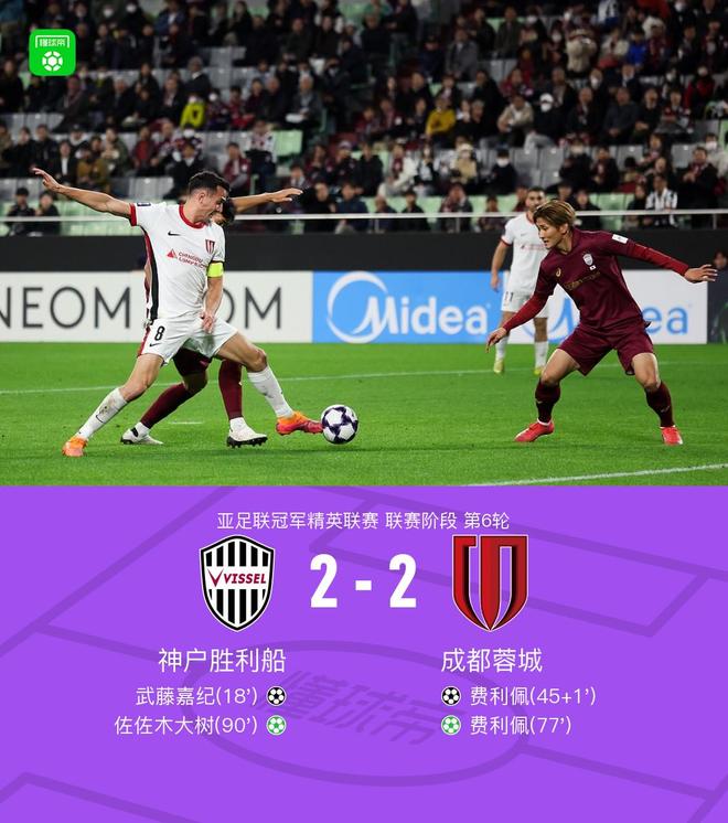 北京时间12月9日,亚冠联赛精英联赛第六轮,神户胜利船对阵成都成都。上半场,武藤芳树率先进球,补时阶段,费利佩扳平比分。下半场,韦世豪造点,费利佩主罚点球帮助球队取得领先。比赛临近结束时,李阳罚出点球,佐佐木大树继续主罚点球。最终,双方战成2-2平。重头戏:第18分钟,武藤芳树背身拿球,将球推入球门。成都队0-1战胜神户队。第45分钟和第1分钟,世界波!周定阳断球助攻,费利佩远射破门,第76分钟成都1-1追平科比,第一!费利佩双击点球得分,成都2-1反超科比。李阳因犯规被罚一分。第90分钟,佐佐木大树主罚点球破门。成都2-2K奥贝。双方玩家进入游戏。比赛第3分钟,董艳峰撞倒对手,吃到黄牌。第7分钟,罗慕洛完成后点射门,皮球被对方门将传出。第11分钟,运气不佳,周定洋的头球击中立柱。第18分钟,武藤芳树背身拿球推射破门。成都队0-1落后神户队。第31分钟,罗慕洛尝试接后点,皮球被解围。第41分钟,莱希特解围后感到不适。第45+1分钟比赛恢复后,世界波!周定阳断球助攻,费利佩远投得分,成都1-1追平科比。第50分钟,费利佩点头球,皮球穿过球门。第56分钟,武藤佳树禁区内完成射门,简涛将球转换。第65分钟扑救,运气不佳,韦第67分钟,石昊传中没有击中,随后皮球击中门柱。武藤芳树干扰射门,但球未能踢出,被没收。第76分钟,比分扳平!费利佩双射破门,成都2-1反超科比。第79分钟,元敏诚、甘超替补登场。胡河涛、董彦峰下场,李洋犯规,判罚点球。第90分钟,佐佐木大树一脚射门破门。成都2-2神户。 90+1分钟,他们逃脱了。科比在补时阶段错失了一次机会。球队阵容 技术统计