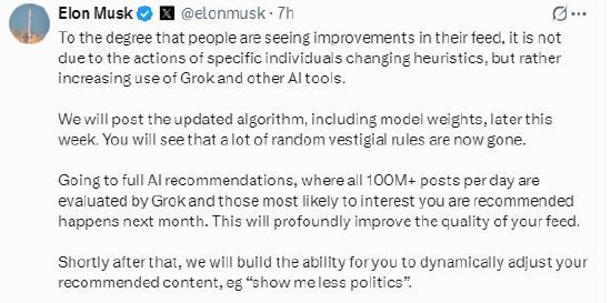 马斯克周二在 X 上发布消息称,他的社交媒体 X 平台将于本周晚些时候发布更新的算法,以实现完全人工智能的推荐。