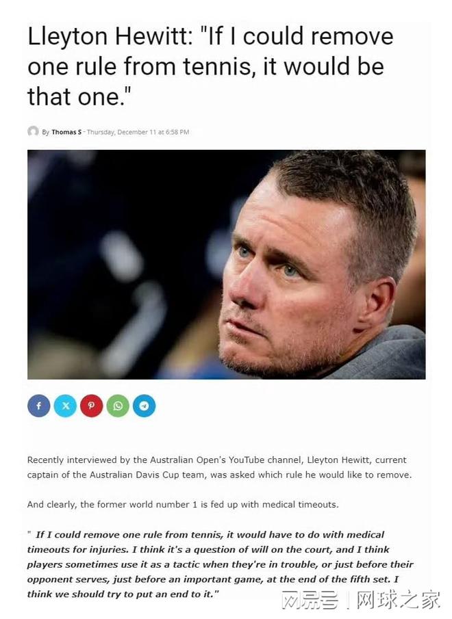 澳大利亚网球明星休伊特最近在澳大利亚网球公开赛的官方采访中没有被提及。他公开呼吁取消网球比赛中的伤病暂停规则。在休伊特看来,伤病暂停规则已经成为比赛中很可能被滥用的漏洞。他特别指出,球员经常在“遇到麻烦时、对手发球之前、关键比赛开始之前或第五盘结束时”请求暂停。这些时间上的巧合让人很难不怀疑他们的动机。 “这取决于场上球员的意愿。”休伊特强调。这位以“永不言败”精神而闻名的澳大利亚球星,在职业生涯中很少因伤退役。他的观点代表了网球运动的传统价值观。网球运动的本质是医学时代争议的焦点。 2012年辛辛那提半决赛,伊万诺维奇以“身体不适”为由申请医疗暂停。下一场比赛,她的对手S哈拉波娃的话被打断了。为此,他愤怒地对裁判喊道:“去检查他的血压。”此前在2009年上海大师赛上,萨芬在领先的情况下被伯蒂奇推翻。赛后,他拒绝与对手握手,并直言对手“不够人性”,指的是他滥用医疗时间规则。俄罗斯“沙皇”的不恰当批评显示了损害规则被用作心理战工具的潜在问题。在职业网球界,确实有一类球员特别擅长利用医疗休假。德约科维奇、皮尔斯等人经常因此受到批评。塞尔维亚天王在2016年美网决赛第四盘1-3落后时申请医疗暂停,直接引发了对手瓦林卡的强烈不满和抗议。 2005年澳网决赛中,休伊特和萨芬多次使用“战术”医疗时间,促使队员们ITF医学委员会提议修改规则。这些争议凸显了现有规则下的灰色地带,即真实伤病和战术禁赛之间的模糊界限。面对日益激烈的争议,网球官员采取了行动。 ITF于2009年出台新规定,明确区分紧急治疗和非紧急治疗。新规则规定,除非赛会医生确认需要紧急治疗,否则医疗时间只能在换场或局间休息时进行,抽筋不再是紧急医疗时间的正当理由。此外,ATP还计划禁止“战术伤病”,并规定抽筋的球员必须坚持到比赛结束,否则将不得不退出。这些改革尝试反映了管理机构平衡球员健康与比赛公平性的努力。然而,网球界对于伤病规则一直存在分歧。美国圣麦肯罗曾问:“你一定要在比赛中受伤吗?你能告诉我,我有点累了,我可以按摩一下我的腿吗?”他指出:“暂停的时机很少是一个机会。”这表明一些玩家可能会利用规则的漏洞来获取不公平的优势。也有观点认为,完全取消伤病规则可能对真正受伤的球员不公平。莎拉波娃还提出了一个折衷方案:向球员收取医疗时间费用,以区分真伤和假伤。休伊特的言论在社交媒体上引发热议。一位网友评论道:“我见过很多‘奇迹’有自己眼睛的医生。球员因病停赛后复出绝非偶然。另一位网友反驳道:“作为一名前职业球员,我知道真正受伤带来的痛苦。我们不能因为有人滥用就取消所有球员必要的医疗支持。”有网友问:“为什么不设置一个固定的条件?”d 篮球时数,让双方都有平等的调整机会,而不是现在单方面的、有争议的时数?” “体育精神的核心是公平竞争。当医疗时间成为游戏策略的一部分时,规则本身的合法性就值得重新审视。而麦肯罗的疑问也不无道理:“网球运动员身体的任何地方,如果用力推,就会受伤。”这一切都值得我们认真思考。 (来源:网球之家 作者:陆小天)